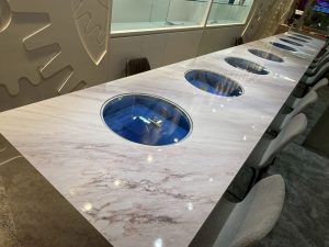 店舗デザインの特徴としは、天井がダイアモンドを横から見た五角形を
